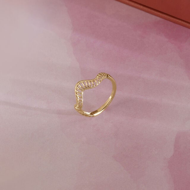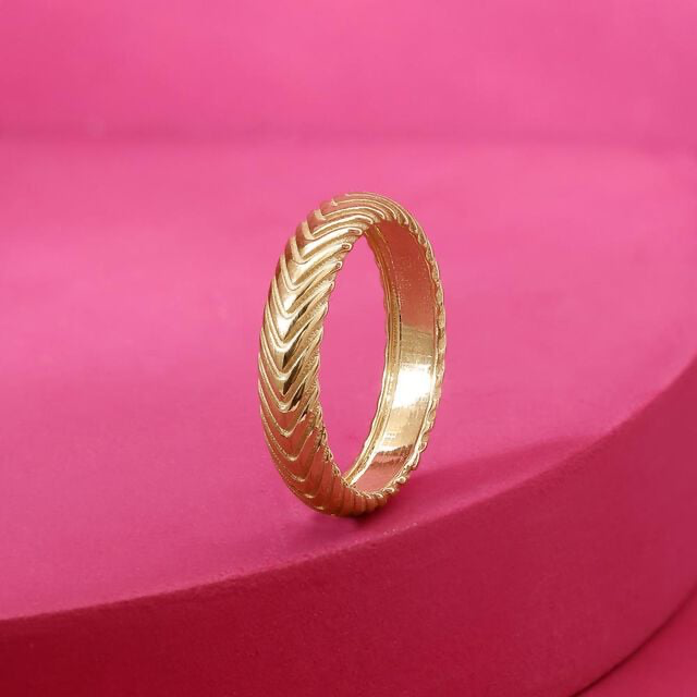 However, take it up a notch by opting for a striking, groovy 14 KT gold ring featuring distinctive chevron-inspired texture! The modern edge, in collaboration with the statement pattern, makes it perfect for women who love to keep it sophisticated yet expressive.