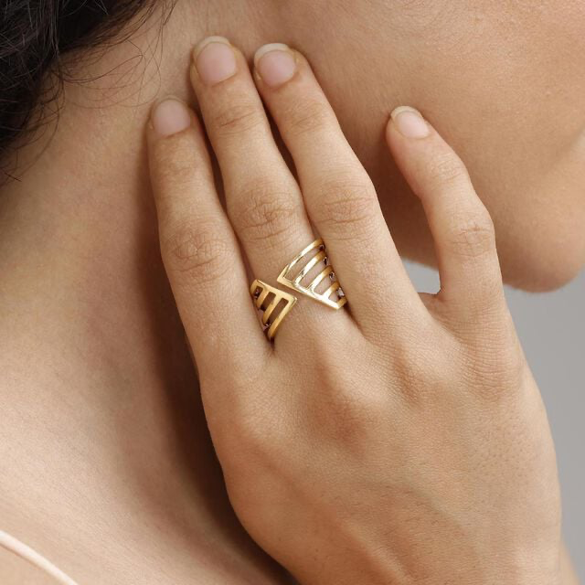 The 14 KT gold ring is characterised by a striking geometric pattern that shall make a bold statement against any outfit base. It symbolises the strength and confidence upon which your relationship is built. The edgy and refined style is ideal for the modern woman who prioritises owning her individuality. Its dramatic silhouette shall remind her of your locked-in promise and the bold love you share.